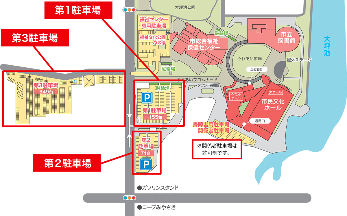 宮崎市民文化ホールの駐車場は台数が限られております。お越しの際は、なるべく公共交通機関をご利用ください。