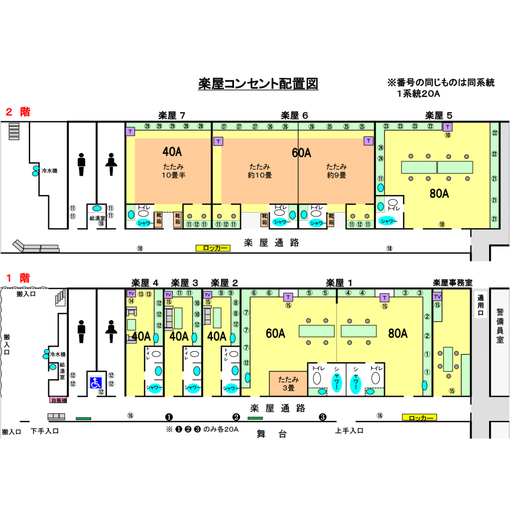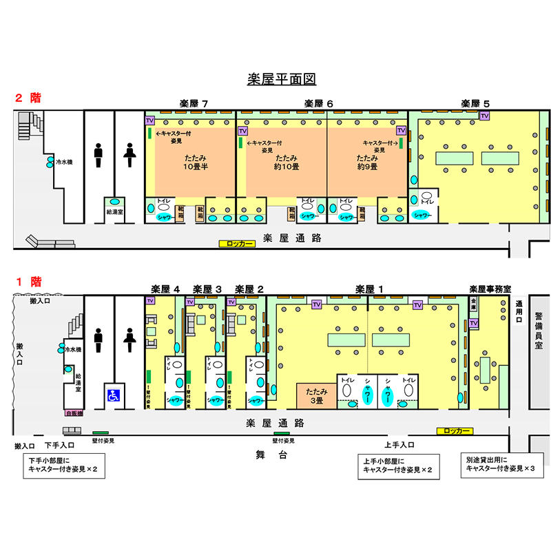 | 楽屋 | 7室 1階 … 楽屋事務室 (洋)、楽屋1 (洋:分割可能)、楽屋2~4 (洋) 2階 … 楽屋5 (洋)、楽屋6 (和:分割可能)、楽屋7 (和) |