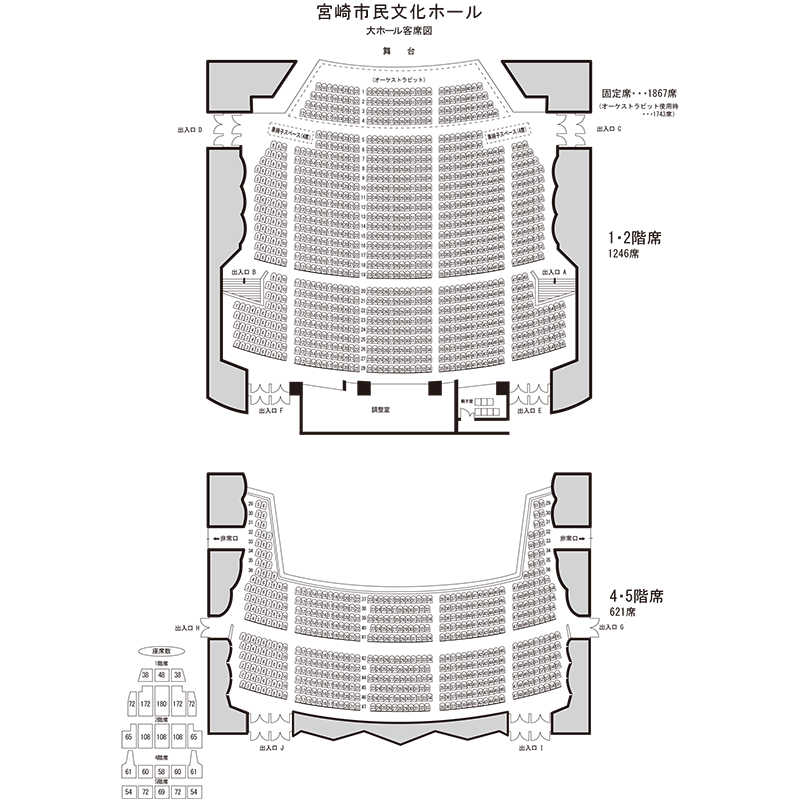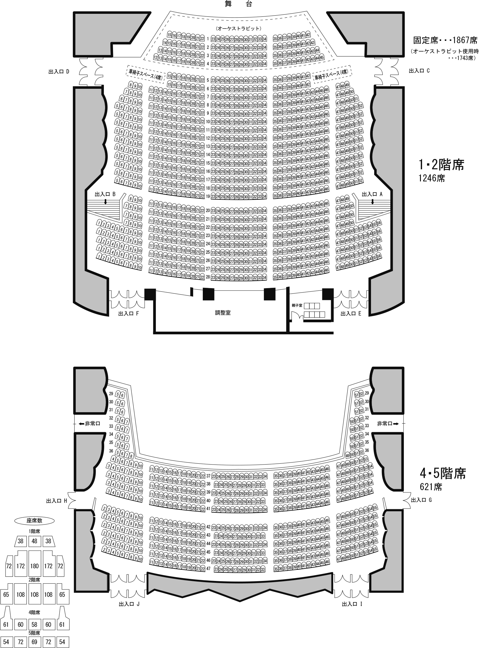 | 座席数 | 固定席:1,867席 (1、2階席1,246席、4、5階席621席) 車椅子スペース:8 親子室:7席 |