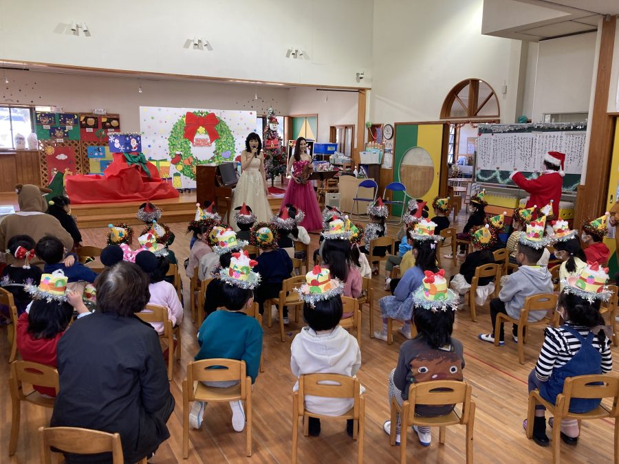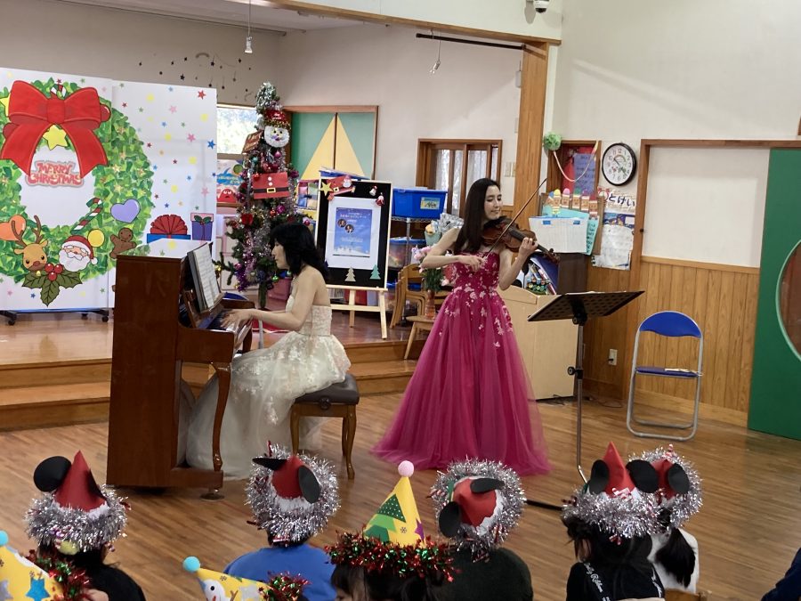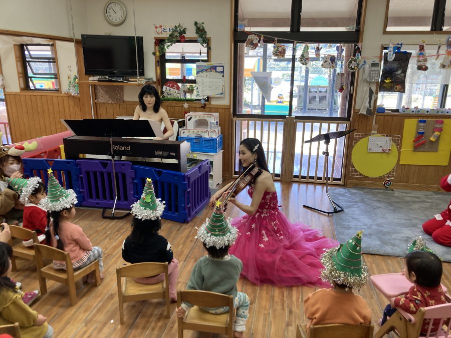 12/23(金)に雪が舞い散る中、高岡町のうちやまこども園で、おでかけ音楽館 「ふれあいミニコンサート」を行いました。